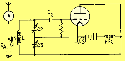 Single-Stage Transmitters A simple, single-tube cw transmitter can be made by coupling the output of an oscillator directly to an antenna (figure 1-28). The primary purpose of the oscillator is to develop an rf voltage which has a constant frequency and is immune to outside factors which may cause its frequency to shift. The output of this simple transmitter is controlled by placing a telegraph key at point K in series with the voltage supply. Since the plate supply is interrupted when the key is open, the circuit oscillates only as long as the key is closed. Although the transmitter shown uses a Colpitts oscillator, any of the oscillators previously described in NEETS, Module 9, Introduction to Wave-Generation and Wave-Shaping Circuits can be used. Figure 1-28. - Simple electron-tube transmitter.