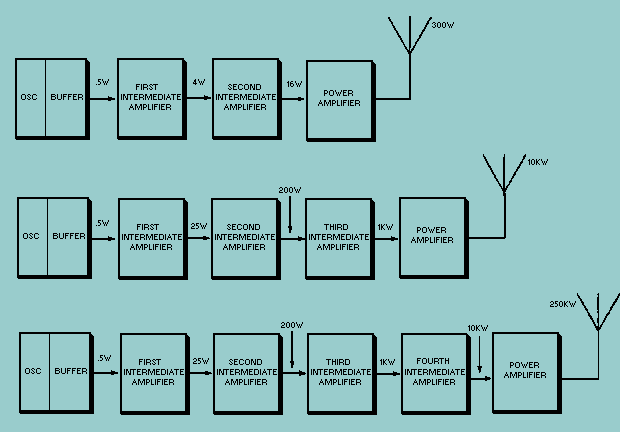 Most mopa transmitters have only one tube amplifier in the power-amplifier stage. However, the oscillator may not produce sufficient power to drive a power-amplifier tube to the power output level required for the antenna. In such cases, the power-amplifier stages are designed to use two or more amplifiers which can be driven by the oscillator. Two or more amplifiers can be connected in parallel (with similar elements of each tube connected) or in a push-pull arrangement. In a push-pull amplifier, the grids are fed equal rf voltages that are 180 degrees out of phase. The main advantage of a mopa transmitter is that the power-amplifier stage isolates the oscillator from the antenna. This prevents changes in antenna-to-ground capacitance from affecting the oscillator frequency. A second advantage is that the rf power amplifier is operated so that a small change in the voltage applied to its grid circuit will produce a large change in the power developed in its plate circuit. Rf power amplifiers require that a specific amount of power be fed into the grid circuit. Only in this way can the tube deliver an amplified power output. However, the stable oscillator can produce only limited amounts of power. Therefore, the mopa transmitter is limited in the amount of power it can develop. This is one of the disadvantages of the mopa transmitter. Another disadvantage is that it often is impractical for use at very- and ultra-high frequencies. The reason is that the stability of self-excited oscillators decreases rapidly as the operating frequency increases. Circuit tuning capacitances are small at high frequencies and stray capacitances adversely affect frequency stability. MULTISTAGE HIGH-POWER TRANSMITTERS. - The power amplifier of a high-power transmitter may require far more driving power than can be supplied by an oscillator. Therefore, one or more low-power intermediate amplifiers may be inserted between the oscillator and the final power amplifier to boost power to the antenna. In some types of equipment, a VOLTAGE AMPLIFIER, called a BUFFER is used between the oscillator and the first intermediate amplifier. The ideal buffer is operated class A and is biased negatively to prevent grid current flow during the excitation cycle. Therefore, it does not require driving power from, nor does it load down, the oscillator. The purpose of the buffer is to isolate the oscillator from the following stages and to minimize changes in oscillator frequency that occur with changes in loading. A buffer is required when keying takes place in an intermediate or final amplifier operating at comparatively high power. Look at the block diagrams of several medium-frequency transmitters in figure 1-30. The input and output powers are given for each stage. You should be able to see that the power output rating of a transmitter can be increased by adding amplifier tubes capable of delivering the power required. Figure 1-30. - Block diagram of several medium-frequency transmitters.