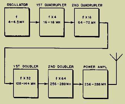 HF AND VHF TRANSMITTERS. - Oscillators are too unstable for direct frequency control in very- and ultra-high frequency transmitters. Therefore, these transmitters have oscillators operating at comparatively low frequencies, sometimes as low as 1/100 of the output frequency. The oscillator frequency is raised to the required output frequency by passing it through one or more FREQUENCY MULTIPLIERS. Frequency multipliers are special rf power amplifiers which multiply the input frequency. In practice, the MULTIPLICATION FACTOR (number of times the input frequency is multiplied) is seldom larger than five in any one stage. The block diagram of a typical vhf transmitter, designed for continuous tuning between 256 and 288 megahertz, is shown in figure 1-31. Figure 1-31. - Block diagram of a vhf transmitter.
