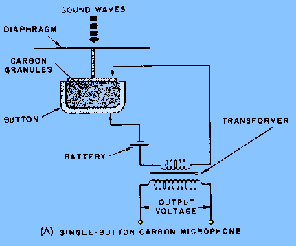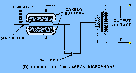 CARBON MICROPHONE. - Operation of the SINGLE-BUTTON CARBON MICROPHONE figure 1-33, view (A) is based on varying the resistance of a pile of carbon granules located within the microphone. An insulated cup, referred to as the button, holds the loosely piled granules. It is so mounted that it is in constant contact with the thin metal diaphragm. Sound waves striking the diaphragm vary the pressure on the button which varies the pressure on the pile of carbon granules. The dc resistance of the carbon granule pile is varied by this pressure. This varying resistance is in series with a battery and the primary of a transformer. The changing resistance of the carbon pile produces a corresponding change in the current of the circuit. The varying current in the transformer primary produces an alternating voltage in the secondary. The transformer steps up the voltage and matches the low impedance of the microphone to the high impedance of the first amplifier. The voltage across the secondary may be as high as 25 volts peak. The impedance of this type of microphone varies from 50 to 200 ohms. This effect is caused by the pressure of compression and rarefaction of sound waves, discussed in chapter 1 of NEETS, Module 10, Introduction to Wave Propagation, Transmission Lines, and Antennas. Figure 1-33A. - Carbon microphones. SINGLE-BUTTON CARBON MICROPHONE