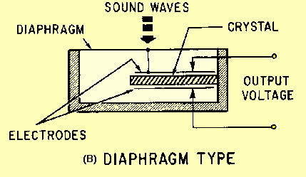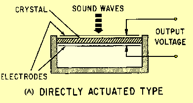 One disadvantage of carbon microphones is that of a constant BACKGROUND HISS (hissing noise) which results from random changes in the resistance between individual carbon granules. Other disadvantages are reduced sensitivity and distortion that may result from the granules packing or sticking together. The carbon microphone also has a limited Frequency response. Still another disadvantage is a requirement for an external voltage source. The disadvantages, however, are offset by advantages that make its use in military applications widespread. It is lightweight, rugged, and can produce an extremely high output. CRYSTAL MICROPHONE. - The CRYSTAL MICROPHONE uses the PIEZOELECTRIC EFFECT of Rochelle salt, quartz, or other crystalline materials. This means that when mechanical stress is placed upon the material, a voltage (emf) is generated. Since Rochelle salt has the largest voltage output for a given mechanical stress, it is the most commonly used crystal in microphones. View (A) of figure 1-34 is a crystal microphone in which the crystal is mounted so that the sound waves strike it directly. View (B) has a diaphragm that is mechanically linked to the crystal so that the sound waves are indirectly coupled to the crystal. Figure 1-34A. - Crystal microphones.