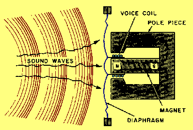 A crystal microphone has a high impedance and does not require an external voltage source. It can be connected directly into the input circuit of a high-gain amplifier. However, because its output is low, several stages of high-gain amplification are required. Crystal microphones are delicate and must be handled with care. Exposure to temperatures above 52 degrees Celsius (125 degrees Fahrenheit) may permanently damage the crystal unit. Crystals are also soluble in water and other liquids and must be protected from moisture and excessive humidity. DYNAMIC MICROPHONE. - A cross section of the DYNAMIC or MOVING-COIL MICROPHONE is shown in figure 1-35. A coil of fine wire is mounted on the back of the diaphragm and located in the magnetic field of a permanent magnet. When sound waves strike the diaphragm, the coil moves back and forth cutting the magnetic lines of force. This induces a voltage into the coil that is an electrical reproduction of the sound waves. Figure 1-35. - Dynamic microphone.