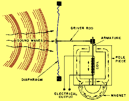 The sensitivity of the dynamic microphone is almost as high as that of the carbon type. It is lightweight and requires no external voltage. The dynamic microphone is rugged and can withstand the effects of vibration, temperature, and moisture. This microphone has a uniform response over a frequency range that extends from 40 to 15,000 hertz. The impedance is very low (generally 50 ohms or less). A transformer is required to match its impedance to that of the input of an af amplifier. MAGNETIC MICROPHONE. - The MAGNETIC or MOVING-ARMATURE MICROPHONE (figure 1-36) consists of a coil wound on an armature that is mechanically connected to the diaphragm with a driver rod. The coil is located between the pole pieces of the permanent magnet. Any vibration of the diaphragm vibrates the armature at the same rate. This varies the magnetic flux in the armature and through the coil. Figure 1-36. - Magnetic microphone action.