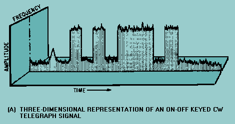 COMPARING FSK AND CW SIGNALS. - A comparison of on-off keyed cw (figure 2-2), (view (A), view (B), view (C)), and fsk (figure 2-3), (view (A), view (B), view (C)), signals will show clearly the principal features of fsk and give us a basis on which frequency modulation can be discussed. Let's use views (A), (B), and (C) of both figures to show the Morse code character "F" for an example. Figures 2-2 and 2-3 are graphic drawings of the two types of keying. Time and amplitude are known dimensions of AM; but to explain fsk properly, we have added the third dimension of frequency. Figure 2-2A. - Comparison of AM and fm receiver response to an AM signal. THREE-DIMENSIONAL REPRESENTATION OF AN ON-OFF KEYED CW TELEGRAPH SIGNAL