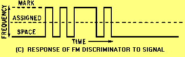 ADVANTAGES OF FSK OVER AM. - Frequency-shift keying is used in all single-channel, radiotelegraph systems that use automatic printing systems. The advantage of fsk over on-off keyed cw is that it rejects unwanted signals (noise) that are weaker than the desired signal. This is true of all fm systems. Also, since a signal is always present in the fsk receiver, automatic volume control methods may be used to minimize the effects of signal fading caused by ionospheric variations. The amount of inherent signal-to-noise ratio improvement of fsk over AM is approximately 3 to 4 dB. This improvement is because the signal energy of fsk is always present while signal energy is present for only one-half the time in AM systems. Noise is continuously present in both fsk and AM, but is eliminated in fsk reception. Under the rapid fading and high-noise conditions that commonly exist in the high frequency (hf) region, fsk shows a marked advantage over AM. Overall improvement is sometimes expressed as the RATIO OF TRANSMITTED POWERS required to give equivalent transmission results over the two systems. Such a ratio varies widely, depending on the prevailing conditions. With little fading, the ratio may be entirely the result of the improvement in signal-to-noise ratio and may be under 5 dB. However, under severe fading conditions, large amounts of power often fail to give good results for AM transmission. At the same time, fsk may be satisfactory at nominal power. The power ratio (fsk versus AM) would become infinite in such a case. Another application of fsk is at low and very low frequencies (below 300 kilohertz). At these frequencies, keying speeds are limited by the "flywheel" effect of the extremely large capacitance and inductance of the antenna circuits. These circuits tend to oscillate at their resonant frequencies. Frequency-shifting the transmitter and changing the antenna resonance by the same keying impulses will result in much greater keying speeds. As a result, the use of these expensive channels is much more efficient. Q.1 What are the two types of angle modulation? |
