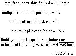 CW SIGNALS. - Since cw signals are of essentially constant frequency, there is no variation along the frequency axis in view (A) of figure 2-2. The complete intelligence is carried as variations in the amplitude of the signal. To receive the intelligence carried by such a signal, the receiving equipment must be able to scan the signal along the time and amplitude axes, which carry the information. When scanned along the time and amplitude axes [shown in view (B)], the intelligence appears as large changes in amplitude. If the circuit were perfect, these variations would be from 0 amplitude to some maximum value (established by transmitter power, distance, and so forth) depending on whether the key were open or closed. However, interfering components of energy caused by atmospherics, interfering stations, and electrical machinery appear as additional variations along the amplitude axis. When these amplitude variations approach or exceed the variation caused by the keyed intelligence, the signal is blanked out by interference. We have all heard this happen on our AM radios during storms or when near operating machinery. View (C) of figure 2-2 represents the same signal when scanned along the time and frequency axes as it would be in an fm receiver. Variations in signal amplitude have no effect on the frequency and no intelligence can be received. Note that the noise and interference components have also been suppressed so that they have little effect on the received signal. Thus, if the intelligence variations were impressed as changes along the frequency axis, and the receiving equipment were designed to respond to this type of signal, then the effects of noise and interference would be practically eliminated. Frequency-shift keyed circuits fulfill these conditions. FSK SIGNALS. - In fsk the rf signal is shifted in frequency (not amplitude) between "key-open" and "key-closed" conditions. The signal amplitude remains essentially constant. View (A) of figure 2-3 represents the letter "F" keyed as a shift in frequency between mark and space. The normal frequency condition with the key open is a space. Recall that this may be either the lower or higher frequency. When the key is closed, the frequency instantly changes to the mark value and remains constant during the marking interval. Opening the key again returns the frequency to the space frequency. Midway between the mark and space frequencies is the assigned channel frequency. Also shown in view (A) is the variation along the amplitude axis caused by the same noise and interference mentioned earlier. The right-hand portion of view (A) illustrates the elimination of this noise by the receiving equipment. View (B) clearly shows that scanning the signal along the amplitude and time axes reproduces no amplitude variations from signal interference. However, if the scanning is accomplished along the frequency and time axes, the intelligence is reproduced, as shown in view (C). By this system, the intelligence can be recovered at the receiving station in its original form; it will be nearly unaffected by conditions in the radio path other than fading. As a matter of fact, fsk resists the effects of fading better than cw. FREQUENCY-SHIFT KEYING. - In its simplest form, frequency-shift keying of a transmitter can be accomplished by shunting a capacitor (or an inductor) and key (in series) across the oscillator circuit. By locking the normal key of the transmitter and operating only the oscillator circuit key, you can change the oscillator frequency. The shift in frequency between mark (key-closed) and space (key-open) conditions is determined by the effect of the additional capacitance (or inductance) on the oscillator frequency. The frequency multiplication factor in the transmitter amplifiers must be taken into consideration when determining the oscillator frequency shift. Thus, if the desired shift is the conventional 850 hertz at the transmission frequency, and this frequency is four times the oscillator frequency (that is, doubled in two stages), then the effect of the additional capacitance (or inductance) on the oscillator must be limited to 212.5 hertz as shown below: