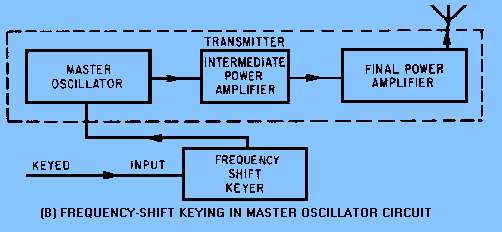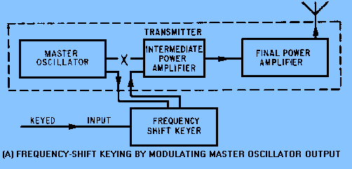Figure 2-4B. - Two methods of frequency-shift keying (fsk). FREQUENCY-SHIFT KEYING IN MASTER OSCILLATOR CIRCUIT