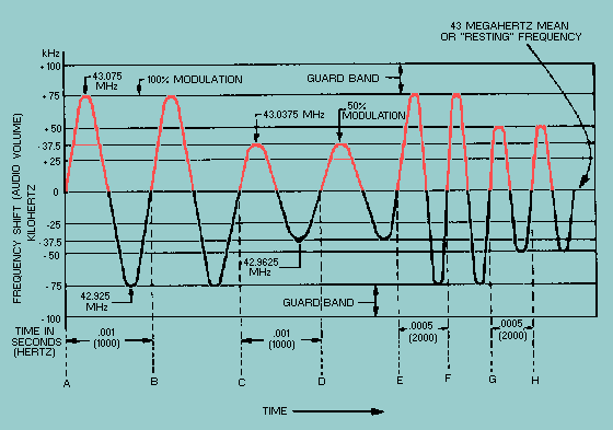 Figure 2-8 shows how the frequency shift of an fm signal goes through the same variations as does the modulating signal. In this figure the dimension of the constant amplitude is omitted. (As these remaining waveforms are presented, be sure you take plenty of time to study and digest what the figures tell you. Look each one over carefully, noting everything you can about them. Doing this will help you understand this material.) If the maximum frequency deviation is set at 75 kilohertz above and below the carrier, the audio amplitude of the modulating wave must be so adjusted that its peaks drive the frequency only between these limits. This can then be referred to as 100-PERCENT MODULATION, although the term is only remotely applicable to fm. Projections along the vertical axis represent deviations in frequency from the resting frequency (carrier) in terms of audio amplitude. Projections along the horizontal axis represent time. The distance between A and B represents 0.001 second. This means that carrier deviations from the resting frequency to plus 75 kilohertz, then to minus 75 kilohertz, and finally back to rest would occur 1,000 times per second. This would equate to an audio frequency of 1,000 hertz. Since the carrier deviation for this period (A to B) extends to the full allowable limits of plus and minus 75 kilohertz, the wave is fully modulated. The distance from C to D is the same as that from A to B, so the time interval and frequency are the same as before. Notice, however, that the amplitude of the modulating wave has been decreased so that the carrier is driven to only plus and minus 37.5 kilohertz, one-half the allowable deviation. This would correspond to only 50-percent modulation if the system were AM instead of fm. Between E and F, the interval is reduced to 0.0005 second. This indicates an increase in frequency of the modulating signal to 2,000 hertz. The amplitude has returned to its maximum allowable value, as indicated by the deviation of the carrier to plus and minus 75 kilohertz. Interval G to H represents the same frequency at a lower modulation amplitude (66 percent). Notice the GUARD BANDS between plus and minus 75 kilohertz and plus and minus 100 kilohertz. These bands isolate the modulation extremes of this particular channel from that of adjacent channels. Figure 2-8. - Frequency-modulating signal.