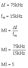 PERCENT OF MODULATION. - Before we explain 100-percent modulation in an fm system, let's review the conditions for 100-percent modulation of an AM wave. Recall that 100-percent modulation for AM exists when the amplitude of the modulation envelope varies between 0 volts and twice its normal umodulated value. At 100-percent modulation there is a power increase of 50 percent. Because the modulating wave is not constant in voice signals, the degree of modulation constantly varies. In this case the vacuum tubes in an AM system cannot be operated at maximum efficiency because of varying power requirements. In frequency modulation, 100-percent modulation has a meaning different from that of AM. The modulating signal varies only the frequency of the carrier. Therefore, tubes do not have varying power requirements and can be operated at maximum efficiency and the fm signal has a constant power output. In fm a modulation of 100 percent simply means that the carrier is deviated in frequency by the full permissible amount. For example, an 88.5-megahertz fm station operates at 100-percent modulation when the modulating signal deviation frequency band is from 75 kilohertz above to 75 kilohertz below the carrier (the maximum allowable limits). This maximum deviation frequency is set arbitrarily and will vary according to the applications of a given fm transmitter. In the case given above, 50-percent modulation would mean that the carrier was deviated 37.5 kilohertz above and below the resting frequency (50 percent of the 150-kilohertz band divided by 2). Other assignments for fm service may limit the allowable deviation to 50 kilohertz, or even 10 kilohertz. Since there is no fixed value for comparison, the term "percent of modulation" has little meaning for fm. The term MODULATION INDEX is more useful in fm modulation discussions. Modulation index is frequency deviation divided by the frequency of the modulating signal. MODULATION INDEX. - This ratio of frequency deviation to frequency of the modulating signal is useful because it also describes the ratio of amplitude to tone for the audio signal. These factors determine the number and spacing of the side frequencies of the transmitted signal. The modulation index formula is shown below: