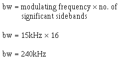 The use of this math is to illustrate that the actual bandwidth of an fm transmitter (240 kHz) is greater than that suggested by its maximum deviation bandwidth (75 kHz, or 150 kHz). This is important to know when choosing operating frequencies or designing equipment. Q.4 What characteristic of a carrier wave is varied in frequency modulation? |