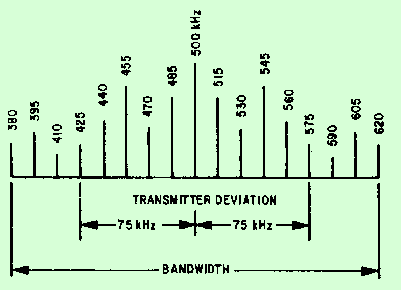 You should be able to see by studying figure 2-9, views (A) and (B), that the modulating frequency determines the spacing of the sideband frequencies. By using a significant sidebands table (such as table 2-1), you can determine the bandwidth of a given fm signal. Figure 2-10 illustrates the use of this table. The carrier frequency shown is 500 kilohertz. The modulating frequency is 15 kilohertz and the deviation frequency is 75 kilohertz.