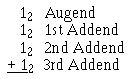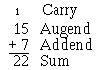 The sum of the augend and the first addend is 0 with a carry. The sum of the second and third addends is also 0 with a carry. At this point the solution resembles the following example:
