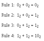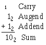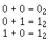 The fourth combination presents a different situation. The sum of 1 and 1 in any other number system is 2, but the numeral 2 does not exist in the binary system. Therefore, the sum of 12 and 12 is 102 (spoken as one zero base two), which is equal to 210.