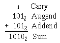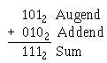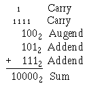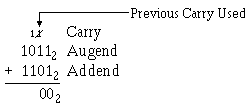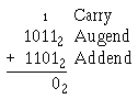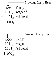 Addition of Binary Numbers Addition of binary numbers is basically the same as addition of decimal numbers. Eachsystem has an augend, an addend, a sum, and carries. The following example will refreshyour memory: