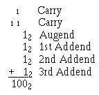 In the final step the remaining carry is brought down to the sum. In the following example you will see that more than one carry may be produced by a single column. This is something that does not occur in the decimal system. Example: Add 12, 12, 12, and 12