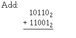 When a carry is produced, it is noted in the column of the next higher value or in the column immediately to the left of the one that produced the carry. Example: Add 10112 and 11012. Solution: Write out the problem as shown: