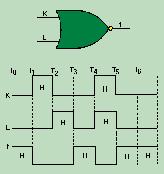 NOR GATE OPERATION The logic level inputs and corresponding outputs for a NOR gate are shown in figure 2-16. At time T0, both K and L are LOW; as a result, f is HIGH. At T1, K goes HIGH, L remains LOW, and f goes LOW. At T2, K goes LOW, L goes HIGH, and the output remains LOW. The output goes HIGH again at T3 when both inputs are LOW. At T4 when both inputs are HIGH, the output goes LOW and remains LOW until T5 when both inputs go LOW. Remember the output is just opposite of what it would be for an OR gate. Figure 2-16. - NOR gate input and output signals.