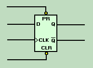Depending on the circuit design, the clock (CLK) can be a square wave, a constant frequency, or asymmetrical pulses. In this example the clock (CLK) input will be a constant input at a given frequency. This frequency is determined by the control unit of the equipment. The data (D) input will be present when there is a need to store information. Notice in the Truth Table that output Q reflects the D input only when the clock transitions from 0 to 1 (LOW to HIGH). Let's assume that at T0, CLK is 0, D is 1, and Q is 0. Input D remains at 1 for approximately 2 1/2 clock pulses. At T1, when the clock goes to 1, Q also goes to 1 and remains at 1 even though D goes to 0 between T2 and T3. At T3, the positive-going pulse of the clock causes Q to go to 0, reflecting the condition of D. The positive-going clock pulse at T5 causes no change in the output because D is still LOW. Between T5 and T6, D goes HIGH, but Q remains LOW until T7 when the clock goes HIGH. The key to understanding the output of the D FF is to remember that the data (D) input is seen in the output only after the clock has gone HIGH. You may see D FF symbols with two additional inputs - CLR (clear) and PR (preset). These inputs are used to set the start condition of the FF - CLR sets Q to 0; PR sets Q to 1. Figure 3-17 shows the standard symbol with the CLR and PR inputs. Since these inputs are preceded by inverters (part of the FF), a LOW-going signal is necessary to activate the FF. These signals (CLR and PR) override any existing condition of the output. Figure 3-17. - D flip-flop with PR and CLR inputs.