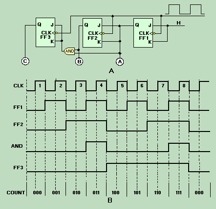 Assume that A, B, C, and D are lamps and that all the FFs are reset. The lamps will all be out, and the count indicated will be 00002. The negative-going pulse of clock pulse 1 causes FF1 to set. This lights lamp A, and we have a count of 00012. The negative-going pulse of clock pulse 2 toggles FF1, causing it to reset. This negative-going input to FF2 causes it to set and causes B to light. The count after two clock pulses is 00102, or 210. Clock pulse 3 causes FF1 to set and lights lamp A. The setting of FF1 does not affect FF2, and lamp B stays lit. After three clock pulses, the indicated count is 00112. Clock pulse 4 causes FF1 to reset, which causes FF2 to reset, which causes FF3 to set, giving us a count of 01002. This step shows the ripple effect. This setting and resetting of the FFs will continue until all the FFs are set and all the lamps are lit. At that time the count will be 11112 or 1510. Clock pulse 16 will cause FF1 to reset and lamp A to go out. This will cause FF2 through FF4 to reset, in order, and will extinguish lamps B, C, and D. The counter would then start at 00012 on clock pulse 17. To display a count of 1610 or 100002, we would need to add another FF. The ripple counter is also called an ASYNCHRONOUS counter. Asynchronous means that the events (setting and resetting of FFs) occur one after the other rather than all at once. Because the ripple count is asynchronous, it can produce erroneous indications when the clock speed is high. A high-speed clock can cause the lower stage FFs to change state before the upper stages have reacted to the previous clock pulse. The errors are produced by the FFs' inability to keep up with the clock. Synchronous Counter High-frequency operations require that all the FFs of a counter be triggered at the same time to prevent errors. We use a SYNCHRONOUS counter for this type of operation. The synchronous counter is similar to a ripple counter with two exceptions: The clock pulses are applied to each FF, and additional gates are added to ensure that the FFs toggle in the proper sequence. A logic diagram of a three-state (modulo-8) synchronous counter is shown in figure 3-24, view A. The clock input is wired to each of the FFs to prevent possible errors in the count. A HIGH is wired to the J and K inputs of FF1 to make the FF toggle. The output of FF1 is wired to the J and K inputs of FF2, one input of the AND gate, and indicator A. The output of FF2 is wired to the other input of the AND gate and indicator B. The AND output is connected to the J and K inputs of FF3. The C indicator is the only output of FF3. Figure 3-24. - Three-stage synchronous counter: A. Logic diagram; B. Timing Diagram.