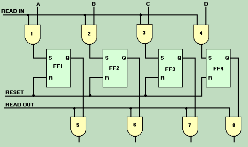 A negative-going pulse is applied to all PS terminals to start the countdown. This causes all the FFs to set and also lights indicators A, B, and C. The beginning count is 1112 (710). At the same time, LOWs are applied to the CLK inputs of FF2 and FF3, but they do not toggle because the PS overrides any change. All actions in the counter will take place on the negative-going portion of the input pulse. Let's go through the pulse sequences in figure 3-27, view B. CP1 causes FF1 to toggle and output Q to go LOW. Lamp A is turned off. Notice that Q goes HIGH but no change occurs in FF2 or FF3. Lamps B and C are now on, A is off, and the indicated count is 1102 (610). CP2 toggles FF1 again and lights lamp A. When Q goes HIGH, Q goes LOW. This negative-going signal causes FF2 to toggle and reset. Lamp B is turned off, and a HIGH is felt at the CLK input of FF3. The indicated count is 1012 (510); lamps A and C are on, and B is off. At CP3, FF1 toggles and resets. Lamp A is turned off. A positive-going signal is applied to the CLK input of FF2. Lamp B remains off and C remains on. The count at this point is 1002 (410). CP4 toggles FF1 and causes it to set, lighting lamp A. Now FF1, output Q, goes LOW causing FF2 to toggle. This causes FF2 to set and lights lamp B. Output of FF2, Q, then goes LOW, which causes FF3 to reset and turn off lamp C. The indicated count is now 0112 (310). The next pulse, CP5, turns off lamp A but leaves B on. The count is now 0102. CP6 turns on lamp A and turns off lamp B, for a count of 0012. CP7 turns off lamp A. Now all the lamps are off, and the counter indicates 000. On the negative-going signal of CP8, all FFs are set, and all the lamps are lighted. The CLK pulse toggles FF1, making output Q go HIGH. As output Q goes LOW, the negative-going signal causes FF2 to toggle. As FF2, output Q, goes HIGH, output Q goes LOW, causing FF3 to toggle and set. As each FF sets, its indicator lamp lights. The counter is now ready to again start counting down from 1112 with the next CLK pulse. Q.49 How many FFs are required to count down from 1510? REGISTERS A register is a temporary storage device. Registers are used to store data, memory addresses, and operation codes. Registers are normally referred to by the number of stages they contain or by the number of bits they will store. For instance, an eight-stage register would be called an 8-bit register. The contents of the register is also called a WORD. The contents of an 8-bit register is an 8-bit word. The contents of a 4-bit register is a 4-bit word and so forth. Registers are also used in the transfer of data to and from input and output devices such as teletypes, printers, and cathode-ray tubes. Most registers are constructed of FFs and associated circuitry. They permit us to load or store data and to transfer the data at the proper time. PARALLEL REGISTERS Parallel registers are designed to receive or transfer all bits of data or information simultaneously. A 4-bit parallel register is shown in figure 3-28. The data inputs are A, B, C, and D. The FFs store the data until it is needed. AND gates 5, 6, 7, and 8 are the transfer gates. Figure 3-28.Four-bit parallel register.