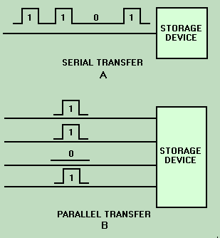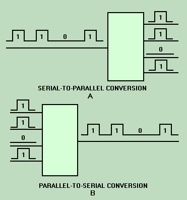 Serial-to-parallel conversion or parallel-to-serial conversion describes the manner in which data is stored in a storage device and the manner in which that data is removed from the storage device. Serial-to-parallel conversion means that data is transferred into the storage device or register in serial fashion and removed in parallel fashion, as in figure 3-30, view A. Parallel-to-serial conversion means the data is transferred into the storage device in parallel and removed as serial data, as shown in view B. Figure 3-30. - Data conversion methods: A. Serial-to-parallel; B. Parallel-to-serial.