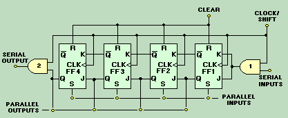 A CLEAR pulse resets all the FFs at CP1. At CP2, the most significant bit of the data is input to AND gate 1. This HIGH along with the clock pulse causes AND gate 1 to output a HIGH. The HIGH from the AND gate and the clock pulse applied to FF1 cause the FF to set. FFs 2, 3, and 4 are held reset. At this point, the MSD of the data has been shifted into the register. The next bit of data is a 0. The output of AND gate 1 is LOW. Because of the inverter on the K input of FF1, the FF senses a HIGH at that input and resets. At the same time this is occurring, the HIGH on the J input of FF2 (from FF1) and the CLK cause FF2 to set. The two MSDs, 1 and 0, are now in the register. CP4 causes FF3 to set and FF2 to reset. FF1 is set by the CLK pulse and the third bit of the number. The register now contains 01012, as a result of shifting the first three bits of data. The remaining bit is shifted into the register by CP5. FF1 remains set, FF2 sets, FF3 resets, and FF4 sets. At this point, the serial transfer is complete. The binary word can be sampled on the parallel output lines. Once the parallel data is transferred, a CLEAR pulse resets the FFs (CP6), and the register is ready to input the next word. Scaling Operation Using the shift register shown in figure 3-31 for scaling a number is quite simple. The number to be scaled is loaded into the register either in serial or parallel form. Once the data is in the register, the scaling takes place in the same manner as that for shifting the data for serial output. A single clock pulse will cause each bit of data to shift one place to the left. Remember that each shift is the equivalent of increasing the value by a power of 2. The scaled data is read from the parallel outputs. Care must be taken not to overshift the data to the point that the MSDs are shifted out of the register. Q.54 Serial-to-parallel and parallel-to-serial conversions are accomplished by what