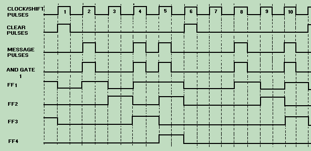 At CP1, a CLEAR pulse is applied to all the FFs, resetting the register to a count of 0. The number 01012 is applied to the parallel inputs at CP2, causing FF1 and FF3 to set. At this point, the J inputs of FF2 and FF4 are HIGH. AND gate 2 has a LOW output since the FF4 output is LOW. This LOW output represents the first digit of the number 01012 to be output in serial form. At the same time we have HIGHs on the K inputs of FF1 and FF3. (Notice the NOT symbol on FF1 at input K. With no serial input to AND gate 1, the output is LOW; therefore, the K input to FF1 is held HIGH). With these conditions CP3 causes FF1 and FF3 to reset and FF2 and FF4 to set. The HIGH output of FF4, along with CP3, causes AND gate 2 to output a HIGH. This represents the second digit of the number 01012. At CP4, FF2 and FF4 reset, and FF3 sets. FF1 remains reset because of the HIGH at the K input. The output of AND gate 2 goes LOW because the output of FF4 is LOW and the third digit of the number is output on the serial line. CP5 causes FF4 to set and FF3 to reset. CP5 and the HIGH from FF4 cause AND gate 2 to output the last digit of the number on the serial line. It took a total of four CLK pulses to input the number in parallel and output it in serial. CP6 causes FF4 to reset and effectively clears the register for the next parallel input. Between CP7 and CP10, the number 11102 is input as parallel data and output as serial data. Serial-to-Parallel Conversion Serial input is accomplished much in the same manner as serial output. Instead of shifting the data out one bit at a time, we shift the data in one bit at a time. To understand this conversion, you should again use figure 3-31 and also the timing diagram shown in figure 3-33. In this example we will convert the number 10112 from serial data to parallel data. Figure 3-33. - Serial-to-parallel conversion timing diagram.