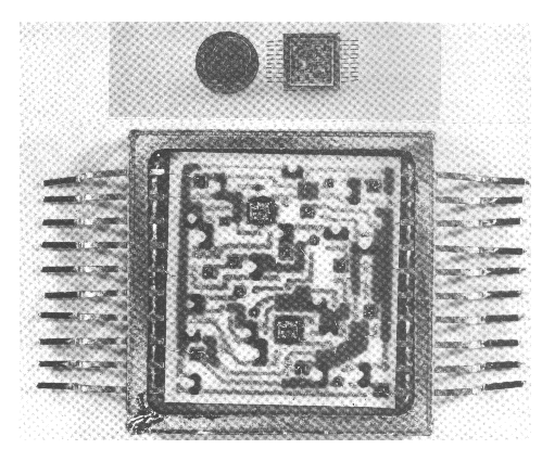 INTEGRATED CIRCUITS Many advertisements for electronic equipment refer to integrated circuits or solid-state technology. You know the meaning of the term solid-state, but what is an INTEGRATED CIRCUIT? The accepted Navy definition for an integrated circuit is that it consists of elements inseparably associated and formed on or within a single SUBSTRATE (mounting surface). In other words, the circuit components and all interconnections are formed as a unit. You will be concerned with three types of integrated circuits: MONOLITHIC, FILM, and HYBRID. MONOLITHIC INTEGRATED CIRCUITS are those that are formed completely within a semiconductor substrate. These integrated circuits are commonly referred to as SILICON CHIPS. FILM INTEGRATED CIRCUITS are broken down into two categories, THIN FILM and THICK FILM. Film components are made of either conductive or nonconductive material that is deposited in desired patterns on a ceramic or glass substrate. Film can only be used as passive circuit components, such as resistors and capacitors. Transistors and/or diodes are added to the substrate to complete the circuit. Differences in thin and thick film will be discussed later in this topic. HYBRID INTEGRATED CIRCUITS combine two or more integrated circuit types or combine one or more integrated circuit types and DISCRETE (separate) components. Figure 1-5 is an example of a hybrid integrated circuit consisting of silicon chips and film circuitry. The two small squares are chips and the irregularly shaped gray areas are film components. Figure 1-5. - Hybrid integrated circuit.