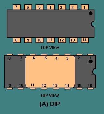 IC PACKAGE LEAD IDENTIFICATION (NUMBERING) When you look at an IC package you should notice that the IC could be connected incorrectly into a circuit. Such improper replacement of a component would likely result in damage to the equipment. For this reason, each IC has a REFERENCE MARK to align the component for placement. The dual inline package (both plastic and ceramic) and the flat pack have a notch, dot, or impression on the package. When the package is viewed from the top, pin 1 will be the first pin in the counterclockwise direction next to the reference mark. Pin 1 may also be marked directly by a hole or notch or by a tab on it (in this case pin 1 is the counting reference). When the package is viewed from the top, all other pins are numbered consecutively in a counterclockwise direction from pin 1, as shown in figure 1-30, views (A) and (B). Figure 1-30A. - DIP and flat-pack lead numbering. DIP