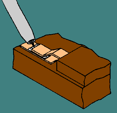Motorized Vacuum Method. - In the motorized vacuum method, the heated tip is applied to the solder joint. When melted solder is observed, the vacuum is activated by the technician causing the solder to be withdrawn from the joint and deposited into the chamber. If the lead is preclipped, it may also be drawn into a holding chamber. To prevent SWEATING (reforming a solder joint) to the side walls of the plated-through hole joint, the lead is "stirred" with the tip while applying the vacuum. This permits cool air to flow into and around the lead and side walls causing them to cool. Motorized Pressure Method. - In the pressure method, the tip is used to apply heat to a pin for melting a sweat joint. The air pressure is forced through the hole to melt sweat joints without contacting the delicate pad. This method is seldom used because it is not effective in preventing sweating of the lead to the hole nor for cooling the workpiece. Hot-Air Jet Method. - The hot-air jet method uses pressure-controlled, heated air to transfer heat to the solder joint without physical contact from a solder iron. This permits the reflow of delicate joints while minimizing mechanical damage. When the solder is removed from the lead and pad area, the technician can observe the actual condition of the lead contact to the pad area and the amount of the remaining solder joint. From these observed conditions, the technician can then determine a method of removing the component and lead. With straight-through terminations, the component and lead may be lifted gently from uncoated boards with pliers or tweezers. Working with clinched leads on uncoated boards requires that all sweat joints be removed and that the leads be unclinched before removal. The techniques that have been described represent the successful methods of desoldering components. As mentioned at the beginning of this section, the 2M technician must decide which method is best suited for the type of solder joint. Two commonly used but unacceptable methods of solder removal are heat-and-shake and heat-and-pull methods. In the heat-and-shake method, the solder joint is melted and then the molten solder is shaken from the connection. In some cases, the shaking action may include striking the assembly against a surface to shake the molten solder out of the joint. This method should NEVER be used because all the solder may not be removed and the solder may splatter over other areas of the board. In addition, striking the board against a surface can lead to broken boards, damaged components, and lifted pads or conductors. The heat-and-pull method uses a soldering iron or gang-heater blocks to melt individual or multiple solder joints. The component leads are pulled when the solder is melted. This method has many shortcomings because of potential damage and should NOT be attempted. Heating blocks are patterned to suit specific configurations; but when used on multiple-lead connections, the joints may not be uniformly heated. Uneven heating results in plated-through hole damage, pad delamination, or blistering. Damage can also result when lead terminations are pulled through the board. When desoldering is complete, the workpiece must undergo a careful physical inspection for damage to the circuit board and the remaining components. The technician should also check the board for scorching or charring caused by component failure. Sometimes MEASLING is present. Measling is the appearance of light-colored spots. It is caused by small areas of fiberglass strands that have been damaged by epoxy overcuring, heat, abrasion, or internal moisture. No cracks or breaks should be visible in the board material. None of the remaining components should be cracked, broken, or show signs of overheating. The solder joints should be of good quality and not covered by loose or splattered solder, which may cause shorts. The technician should examine the board for nicked, cracked, lifted, or delaminated conductors and lifted or delaminated pads. Q.10 When does most printed circuit board damage occur? |