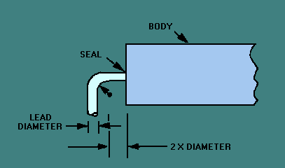 INSTALLATION AND SOLDERING OF PRINTED CIRCUIT COMPONENTS The 2M technician should restore the electronic assembly at least to the original manufacturer's standards. Parts should always be remounted or reassembled in the same position and with termination methods used by the original manufacturer. This approach ensures a continuation of the original reliability of the system. High reliability connections require thoroughly cleaned surfaces, proper component lead formation and termination, and appropriate placement of components on the board. The following paragraphs describe the procedures for properly installing components on a board including the soldering of these components. Termination Area Preparation The termination areas on the board and the component leads are thoroughly cleaned to remove oxide, old solder, and other contaminants. Old or excess solder is removed by one of the desoldering techniques explained earlier in this topic. A fine abrasive, such as an oil-free typewriter eraser, is used to remove oxides. This is not necessary if the area has just been desoldered. All areas to be soldered are cleaned with a solvent and then dried with a lint-free tissue to remove cleaning residue. Component Lead Preparation Component leads are formed before installation. Both machine- and hand-forming methods are used to form the leads. Improper lead formation causes many repairs to be unacceptable. Damage to the SEALS (point where lead enters the body of the component) occurs easily during the forming process and results in component failure. Consequently, lead-forming procedures have been established. To control the lead-forming operation and ensure conformity and quality of repairs, the technician should ensure the following: The component is centered between the holes, and component leads are formed with proper bend-radii and body seal-to-bend distance. The possibility of straining component body seals during lead forming is eliminated. Stress relief loops are formed without straining component seals while at the same time providing the desired lead-to-lead distances. Leads are measured and formed for both horizontal and vertical component mounting. Transistor leads are formed to suit standard hole spacing. Lead-Forming Specifications. Component leads are formed to provide proper lead spacing. The minimum distance between the seal (where the lead enters the body of the component) and the start of the lead bend must be no less than twice the diameter of the lead, as shown in figure 3-13. Figure 3-13. - Minimum distance lead bend to component body.