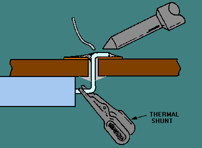 Soldering of PCB Components The fundamental principles of solder application must be understood and observed to ensure consistent and satisfactory results. As discussed in topic 2, the soldering process involves a metal-solvent action that joins two metals by dissolving a small amount of the metals at their point of contact. SOLDERABILITY. - As the solder interacts with the base metals, a good metallurgical bond is obtained and metallic continuity is established. This continuity is good for electrical and heat conductivity as well as for strength. Solderability measures the ease with which molten solder wets the surfaces of the metals being joined. WETTING means the molten solder leaves a continuous permanent film on the metal surface. Wetting can only be done properly on a clean surface. All dirt and grease must be removed and no oxide layer must exist on the metal surface. Using abrasives and/or flux to remove these contaminants produces highly solderable surfaces. HEAT SOURCE. - The soldering process requires sufficient heat to produce alloy- or metal-solvent action. Heat sources include CONDUCTIVE, RESISTIVE, CONVECTIVE, and RADIANT types. The type of heat source most commonly used is the conductive-type soldering iron. Delicate electronic assemblies require that the thermal characteristics of a soldering iron be carefully balanced and that the iron and tip be properly matched to the job. Successful soldering depends on the combination of the iron tip temperature, the capacity of the iron to sustain temperature, the time of iron contact with the joint, and the relative mass and heat transfer characteristics of the object being soldered. SELECTION OF PROPER TIP. - The amount of heat and how it is controlled are critical factors to the soldering process. The tip of the soldering iron transfers heat from the iron to the work. The shape and size of the tip are mainly determined by the type of work to be performed. The tip size and the wattage of the element must be capable of rapidly heating the mass to the melting temperature of solder. After the proper tip is selected and attached to the iron, the operator may control the heat by using the variable-voltage control. The most efficient soldering temperature is approximately 550 degrees Fahrenheit. Ideally, the joint should be brought to this temperature rapidly and held there for a short period of time. In most cases the soldering action should be completed within 2 or 3 seconds. When soldering a small-mass connection, control the heat by decreasing the size of the tip. Before heat is applied to solder the joint, a thermal shunt is attached to sensitive component leads (diodes, transistors, and ICs). A thermal shunt is used to conduct heat away from the component. Because of its large heat content and high thermal conductivity, copper is usually used to make thermal shunts. Aluminum also has good conductivity but a smaller heat content; it is also used to conduct heat, especially if damage from the physical weight of the clamp is possible. Many types, shapes, and sizes of thermal shunts are available. The most commonly used is the clamp design; this is a spring clip (similar to an alligator clip) that easily fastens onto the part lead, as shown in figure 3-16. Figure 3-16. - Thermal shunt.
