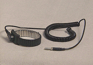 Prevention of ESD Damage Certified 2M technicians are trained in procedures for reducing the causes of ESD damage. The procedures are similar for all levels of maintenance. The following procedure is an example of some of the protective measures used to prevent ESD damage. Before starting to service equipment, the technician should be grounded to discharge any static electric charge built up on the body. This can be accomplished with the use of a test lead (a single-wire conductor with a series resistance of 1 megohm equipped with alligator clips on each end). One clip end is connected to the grounded equipment frame, and the other clip end is touched with a bare hand. Figure 3-32 shows a more refined ground strap which frees both hands for work. Figure 3-32. - ESD wrist strap.