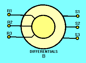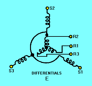 Schematic Symbols Schematic symbols for synchros are drawn by various manufacturers in many different ways. Only five symbols (as shown in figure 1-3), however, meet the standard military specifications for schematic diagrams of synchros and synchro connections. When a symbol is used on a schematic, it will be accompanied by the military abbreviation of one of the eight synchro functional classifications (TR, TX, TDX, etc.). The symbols shown in views A and B of figure 1-3 are used when it is necessary to show only the external connections to a synchro, while those shown in views C, D, and E are used when it is important to see the positional relationship between the rotor and stator. The letters R and S, in conjunction with an Arabic number, are used to identify the rotor and stator connections; for example, R1, R2, S1, S2, and S3. The small arrow on the rotor symbol indicates the angular displacement of the rotor; in figure 1-3 the displacement is zero degrees. Figure 1-3A. - Schematic symbols for synchros.
