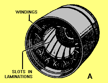 Both types of synchro rotors have their coils wound on laminated cores that are rigidly mounted on a shaft. To enable the excitation voltage to be applied to the rotor winding, two slip rings are mounted on one end of the shaft and insulated from the shaft to prevent shorting. An insulated terminal board, mounted on the end of the cylindrical frame, houses the brushes, which ride on the slip rings. These brushes provide continuous electrical contact to the rotor during its rotation. Also mounted on the rotor shaft are low-friction ball bearings, which permit the rotor to turn easily. The stator of a synchro is a cylindrical structure of slotted laminations on which three Y-connected coils are wound with their axes 120 apart. In figure 1-7, view A shows a typical stator assembly consisting of the laminated stator, stator windings, and cylindrical frame; view B shows the stator lamination and the slots in which the windings are placed. Some synchros are constructed so both the stator and the rotor may be turned. Electrical connections to this type of stator are made through slip rings and brushes. Figure 1-7A. - Typical stator