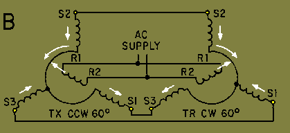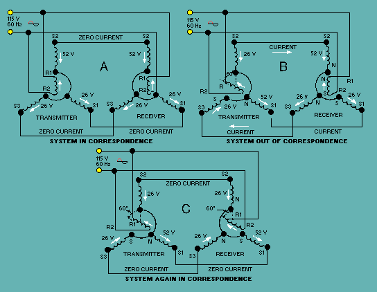 When both transmitter and receiver rotors in a synchro system are on zero or displaced from zero by the same angle, a condition known as CORRESPONDENCE exists. In view A of figure 1-16, the transmitter and receiver are shown in correspondence. In this condition, the rotor of the TR induces voltages in its stator coils (S2 = 52V; S1 and S3 = 26V) that are equal to and opposite the voltages induced into the TX stator coils (S2 = 52V; S1 and S3 = 26V). This causes the voltages to cancel and reduces the stator currents to zero. With zero current through the coils, the receiver torque is zero and the system remains in correspondence. The angle through which a transmitter rotor is mechanically rotated is called a SIGNAL. In view B of figure 1-16, the signal is 60. Now, consider what happens to the two synchros in correspondence when this signal is generated When the transmitter rotor is turned, the rotor field follows and the magnetic coupling between the rotor and stator windings changes. This results in the transmitter S2 coil voltage decreasing to 26 volts, the S3 coil voltage reversing direction, and the S1 coil voltage increasing to 52 volts. This imbalance in voltages, between the transmitter and receiver, causes current to flow in the stator coils in the direction of the stronger voltages. The current flow in the receiver produces a resultant magnetic field in the receiver stator in the same direction as the rotor field in the transmitter. A force (torque) is now exerted on the receiver rotor by the interaction between its resultant stator field and the magnetic field around its rotor. This force causes the rotor to turn through the same angle as the rotor of the transmitter. As the receiver approaches correspondence, the stator voltages of the transmitter and receiver approach equality. This action decreases the stator currents and produces a decreasing torque on the receiver. When the receiver and the transmitter are again in correspondence, as shown in view C, the stator voltages between the two synchros are equal and opposite (S1 = 52V; S2 and S3 = 26V), the rotor torque is zero, and the rotors are displaced from zero by the same angle (60). This sequence of events causes the transmitter and receiver to stay in correspondence. In the system we just explained, the receiver reproduced the signal from the transmitter. As you can see, a synchro system such as this could provide a continuous, accurate, visual reproduction of important information to remote locations. Q.24 What two components make up a simple synchro transmission system? Receiver Rotation When the teeth of two mechanical gears are meshed and a turning force is applied, the gears turn in opposite directions. If a third gear is added, the original second gear turns in the same direction as the first. This is an important concept, because the output of a synchro receiver is often connected to the device it operates through a train of mechanical gears. Whether or not the direction of the force applied to the device and the direction in which the receiver rotor turns are the same depends on whether the number of gears in the train is odd or even. The important thing, of course, is to move the dial or other device in the proper direction. Even when there are no gears involved, the receiver rotor may turn in the direction opposite to the direction you desire. To correct this problem, some method must be used to reverse the receiver's direction of rotation. In the transmitter-receiver system, this is done by reversing the S1 and S3 connections so that SI of the transmitter is connected to S3 of the receiver and vice versa (fig. 1-17), view (A) and view (B). Figure 1-17A. - Effect of reversing the S1 and S3 connections between the transmitter and the receiver.