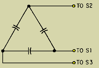 SYNCHRO CAPACITORS As we stated earlier, the speed and accuracy of data transmission are most important. With the use of more complex synchros, like the differential and the control transformer, the accuracy of the synchro systems may be affected. The following discussion will deal with how complex synchros affect the accuracy of synchro systems and what can be done to keep this accuracy as high as possible. Synchro capacitors play a major role in maintaining a high degree of accuracy in synchro systems. When a torque transmitter is connected to a torque receiver (TX-TR), very little, if any, current flows in the stators when the rotors are in correspondence. This is because the voltages induced in the TR windings almost exactly balance out the voltages induced in the TX windings. As a result, the TR is very sensitive to small changes in the position of the TX rotor, causing the TR to follow the TX with a high degree of accuracy. When a synchro system contains differential synchros (TDX or CDX), the stator currents at correspondence are greater than they are in a single TX-TR system. The reason is the step-up turns ratio between the stator and rotor in the differential synchro. In a synchro system that uses a CT, stator current at correspondence is also greater than in a TX-TR system. In this case, however, this reason is that the CT rotor is not energized and as a result no voltage is induced in the stator to oppose the voltage in the transmitter stator. The overall effect of this increase in stator current is to reduce the accuracy of the system. To maintain high accuracy in a synchro system containing either differential units or CTs, the stator currents must be kept to a minimum. This is done by connecting synchro capacitors in the circuit. To understand the operation of a synchro capacitor and how it reduces current drain on the transmitter requires a recollection of the voltage and current relationships in inductive and capacitive circuits. As you learned in module 2 of this series, current lags voltage by 90 in a purely inductive circuit. You also know that an ideal inductor is impossible to make because there is always resistance present. Therefore, an inductor has a combination of inductive reactance and resistance. Since current and voltage are always in phase in a resistive circuit and 90 out of phase in an inductive circuit, we can say that there are two currents in an inductor-the loss current, which is the resistive (in-phase) current, and the magnetizing current, which is the inductive (out-of-phase) current. It is this magnetizing current that we would like to eliminate in the stator coils of the TDX, CDX, and CT because it makes up most of the line current. Keeping in mind that current leads voltage by 90 in a capacitive circuit, let's see what happens to magnetizing current when a capacitor is added to the circuit. Suppose a capacitor is hooked up across one of the stator coils of a TDX and its capacitance is adjusted so that its reactance equals the reactance of the coil. Since the two reactances are equal, the current they draw from the line must also be equal. However, these currents are going to be 180 out of phase, because the current in the coil lags the line voltage, while the capacitor's current leads it. Since the two currents are equal in magnitude but opposite in phase, they cancel. The total line current is reduced by this effect and, if a capacitor is placed across each coil in the TDX, the line current decreases even further. This, in effect, increases torque in synchro systems near the point of correspondence and, therefore, increases overall system accuracy. Connecting capacitors across individual stator windings is impractical because it requires that the stator winding's common connection be outside the synchro. Since this is not done with synchros, another method has been devised to connect up the capacitors which works just as well. This method is shown in figure 1-29. Figure 1-29. - The synchro capacitor.