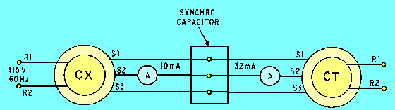 The three delta-connected capacitors, shown in figure 1-29, usually come as a unit mounted in a case with three external connections. The entire unit is called a SYNCHRO CAPACITOR. The synchro capacitor is made in many sizes to meet the requirements of all sizes of standard differentials and control transformers. The synchro capacitor is rated by its total capacity, which is the sum of the individual capacities in the unit. Figure 1-30 shows how a synchro capacitor affects the operation of a control synchro system. In this figure, the capacitor is placed between the CX and the CT. Two current meters are also placed in the circuit to show the effect the capacitor has on stator current. The meter connected between the capacitor and the CT reads normal stator current, 32 milliamperes (mA). This current would normally flow in the stator of the CX if the synchro capacitor were not connected. The other meter reads 10 mA, which is what is left of the original stator current after the magnetizing current has been canceled by the synchro capacitor. By reducing the current drain on the transmitter, the sensitivity and accuracy of the system increase. Figure 1-30. - The use of a synchro capacitor with a CT.