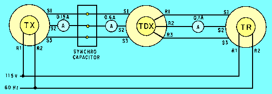 Figure 1-31 shows another application of a synchro capacitor; this time in a differential system. in this circuit the capacitor is placed between a TX and a TDX. The meter readings show the same comparison between currents as in the previous paragraph. The only significant difference between this circuit and the one in figure 1-30 is that the differential draws more stator current than the CT. Figure 1-31. - The use of a synchro capacitor with a TDX.