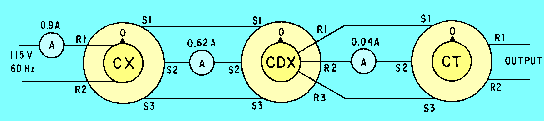 Some synchro systems contain a differential and a control transformer, as illustrated in figure 1-32. In this figure, there are large stator currents flowing in the CX, since it supplies all the losses as well as the magnetizing current for both synchros. Two meters are placed in the circuit to show the value of stator current for the CDX and CT. Another meter is placed in series with the ac excitation voltage to show the amount of current being drawn from the ac line is 0.9 ampere. Figure 1-32. - Synchro current in a control synchro system using a CDX and a CT.