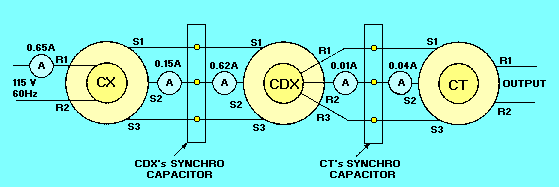 Adding synchro capacitors to this system, as shown in figure 1-33, greatly reduces the stator currents and improves the efficiency of the system. Also, notice that the line current is reduced from 0.9 ampere in figure 1-32 to 0.65 ampere in figure 1-33. Figure 1-33. - The effects of synchro capacitors in a control synchro system using a CDX and a CT.