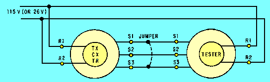These testers are used primarily for locating defective synchros. Although they do provide a method for zeroing synchros, they should not be relied on without question. It is possible for the calibrated dial to slip from its proper position, and since the dial is graduated only every 10, it is difficult to read small angles with accuracy. Therefore, the synchro tester method of zeroing synchros is potentially less accurate than those previously described. To zero a TX, CX or TR using a synchro tester, use the following procedure: Connect the synchro tester as shown in figure 1-43. Figure 1-43. - Zeroing a synchro using a synchro tester.