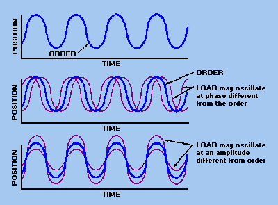 ______________the amount of overshoot before it happens. Frequency response The Frequency response of a servo is the range of frequencies to which the system is able to respond in moving the load. It is a characteristic of the system, chosen by the designers so the system will be able to respond to whatever frequencies are expected to be present in the input signal for the particular application. Oscillating Input Signal At first, we considered the input order to a servo as being suddenly put at a fixed desired value. Later, we studied the case where the order slowly increased to the desired value. Actually, the input order to a servo in a given application may accelerate, start, stop, or oscillate about a fixed point. We will now consider the actions of a servo while the order oscillates. When the order is constant, oscillations of the load are undesirable. When the order oscillates, the load must oscillate in a similar manner. Let's assume that an oscillating input signal (order) is applied to a servo. The load may behave in several ways. Ideally, it would respond in perfect sync with the order. Actually, the amplitude and phase of the load are different from those of the order, figure 2-10. As we noted above, the Frequency response of the system is normally designed so the load is able to respond to the order. Figure 2-10. - Frequency response.