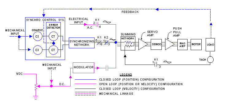 As shown by the relay conditions, the system is configured, in its normal state, as a closed-loop position servo. This is indicated by the heavy dark lines in the figure. An alternate configuration positions the load in this system by using the potentiometer. This is done by energizing relay K2, and switching the system to an open-loop configuration. At the same time, the deenergized contacts of K2 (1-3) open, thereby breaking the closed loop. The open loop is shown by the medium density lines in the figure. This loop is not as accurate as the closed loop, because the operator must intervene by turning the shaft of the potentiometer back to the zero voltage position to stop the load at the desired position. This type of circuit could be used by maintenance personnel to position the load for easy access to equipments, such as on an antenna or gun mount. The open loop can also function as a basic velocity loop by simply not returning the potentiometer to the zero position. This results in a constant error signal being present at the wiper arm of the potentiometer. With this condition, the load will continue to drive at some speed (rate) determined by the components in the loop. The last loop we will consider is the closed-loop velocity servo, indicated by the fine density lines. This loop is switched into operation by energizing K1. Notice that there are two inputs to the summing network with K1 energized, the electrical input through contacts 2-4 and the feedback from the tach through contacts 1-3. The two signals are compared in the summing network, and their difference is used as the error signal to drive the load. When a state of equilibrium is reached in the circuit, the load will be moving at the desired velocity. |