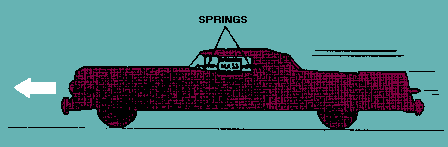 An accelerometer is a device that gives an indication, usually in the form of a voltage, that is proportional to the acceleration to which it is subjected. The operation of an accelerometer is based on the property of INERTIA (Newton's First Law of Motion). A simple demonstration of inertia happens to us almost every day. You know that if your automobile is subjected to acceleration in a forward direction, you are forced back in the seat. If your auto comes to a sudden stop, you are drown forward. When your auto goes into a turn, you tend to be forced away from the direction of the turn-that is, if your auto turns left, you are forced to the right, and vice versa. If we replace the human in an auto with a mass suspended in an elastic mounting system, as shown in figure 3-19, any acceleration of the auto will cause movement of the mass relative to the auto. The amount of displacement is proportional to the force causing the acceleration. The direction the mass moves is always opposite to the direction of the auto's acceleration. Figure 3-19. - Auto with spring-suspended now.