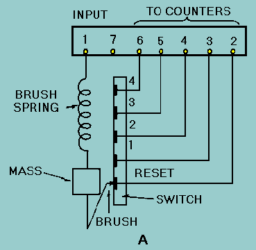 When velocity remains constant, the brush spring holds the mass at null, and the brush rests on the reset contact of the switch. As acceleration occurs, the tendency of the mass to remain at a constant velocity causes the spring to compress. As the spring compresses, it allows the brush to move off the reset contact. If the acceleration is great enough, the brush will pass over the switch contacts for acceleration levels 1, 2, 3, and 4. These levels are determined by the stiffness of the spring. As the brush passes over each contact (in a positive direction), an output pulse from each contact is coupled to one of four counters. This advances the counter one-half count. The accelerometer is designed so that as acceleration decreases, the mass tends to assume the new velocity. The counters will not advance the remaining half count until the brush once again touches the reset contact. With this type of pulse output, it is possible to record each time gravity forces have reached a predetermined level. Q.21 Operation of an accelerometer is based on what physical property? |