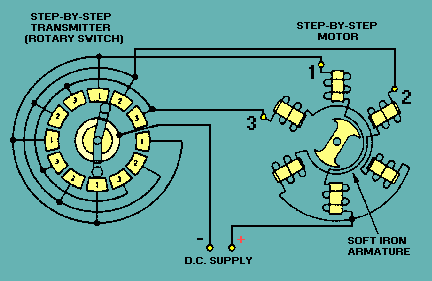 STEP-TRANSMISSION SYSTEMS All of the synchro units we have discussed operate on alternating current. In applications where alternating current is not available, there is a need for a system that can use direct current. The STEP-TRANSMISSION SYSTEM (sometimes referred to as the step-by-step system) is such a system. A geared step-transmission system is often used to drive compass repeaters on naval vessels and merchant ships having dc power. Although many variations are used, the simplified step-by-step transmission system shown in figure 4-3 is typical. In this system, a step transmitter and a step motor are used together to transmit angular data (information) between remote locations. When rotated, the shaft of the step transmitter periodically switches a dc excitation voltage from one pair of coils to another in the step motor. The step motor, which is the receiver in the system, responds to this varying excitation by rotating an amount that is proportional to the transmitter's shaft position. Figure 4-3. - Step-by-step transmission system.