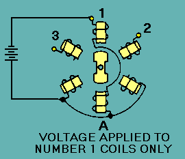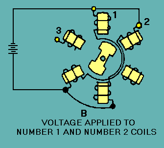 Figure 4-4B. - Step-by-step motor in various positions. VOLTAGE APPLIED TO NUMBER 1 AND NUMBER 2 COILS