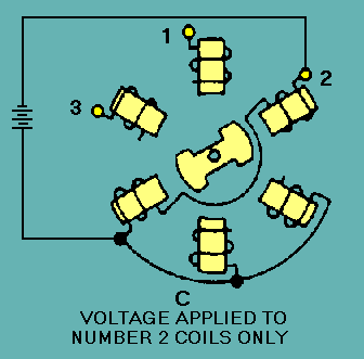 Figure 4-4C. - Step-by-step motor in various positions. VOLTAGE APPLIED TO NUMBER 2 COILS ONLY