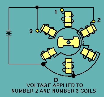 Figure 4-4D. - Step-by-step motor in various positions. VOLTAGE APPLIED TO NUMBER 2 AND NUMBER 3 COILS